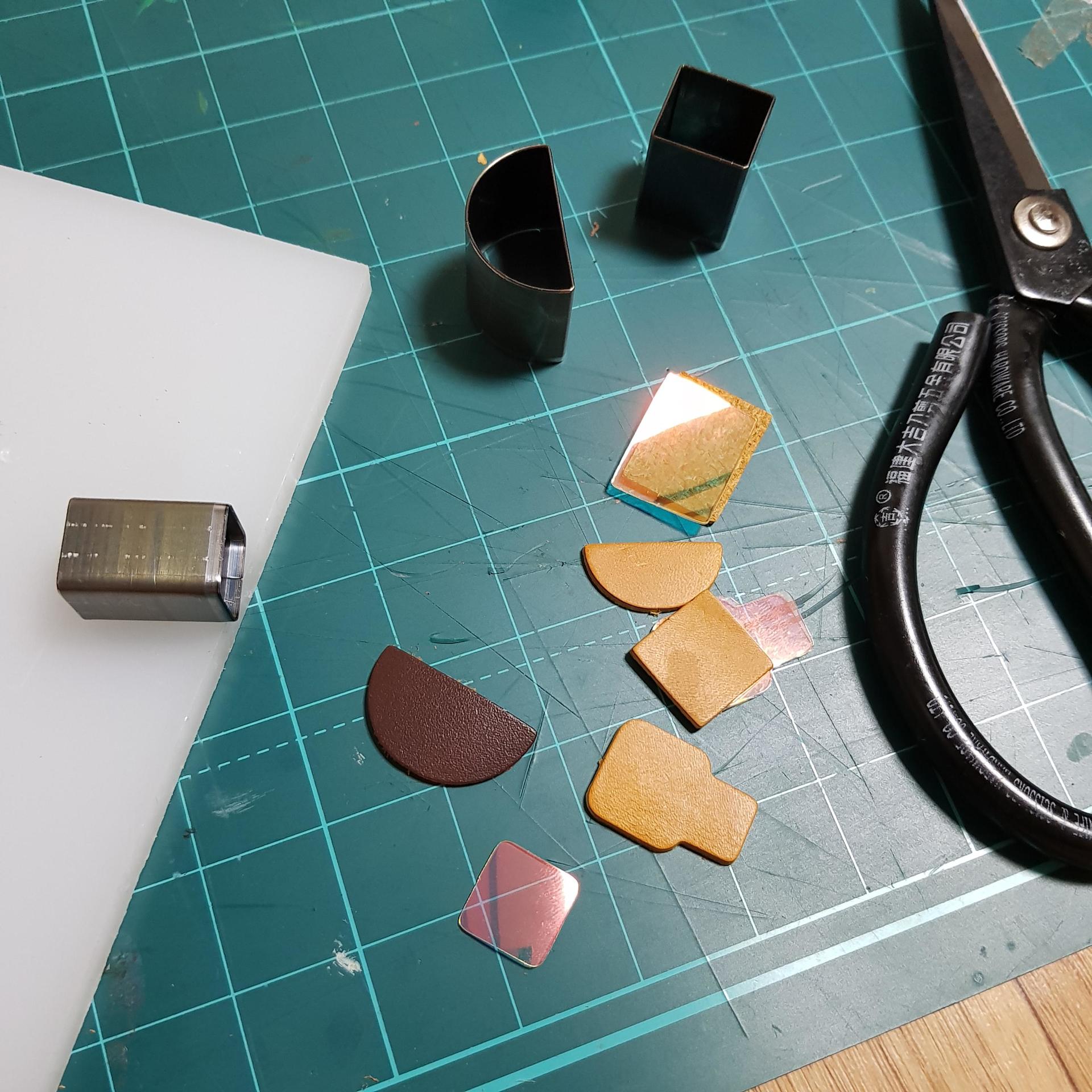 이번 가죽 재단은 커터칼로 일일이 재단하지 않고, 처음부터 모양 커터로 내려쳐서 형태를 조합하였습니다.