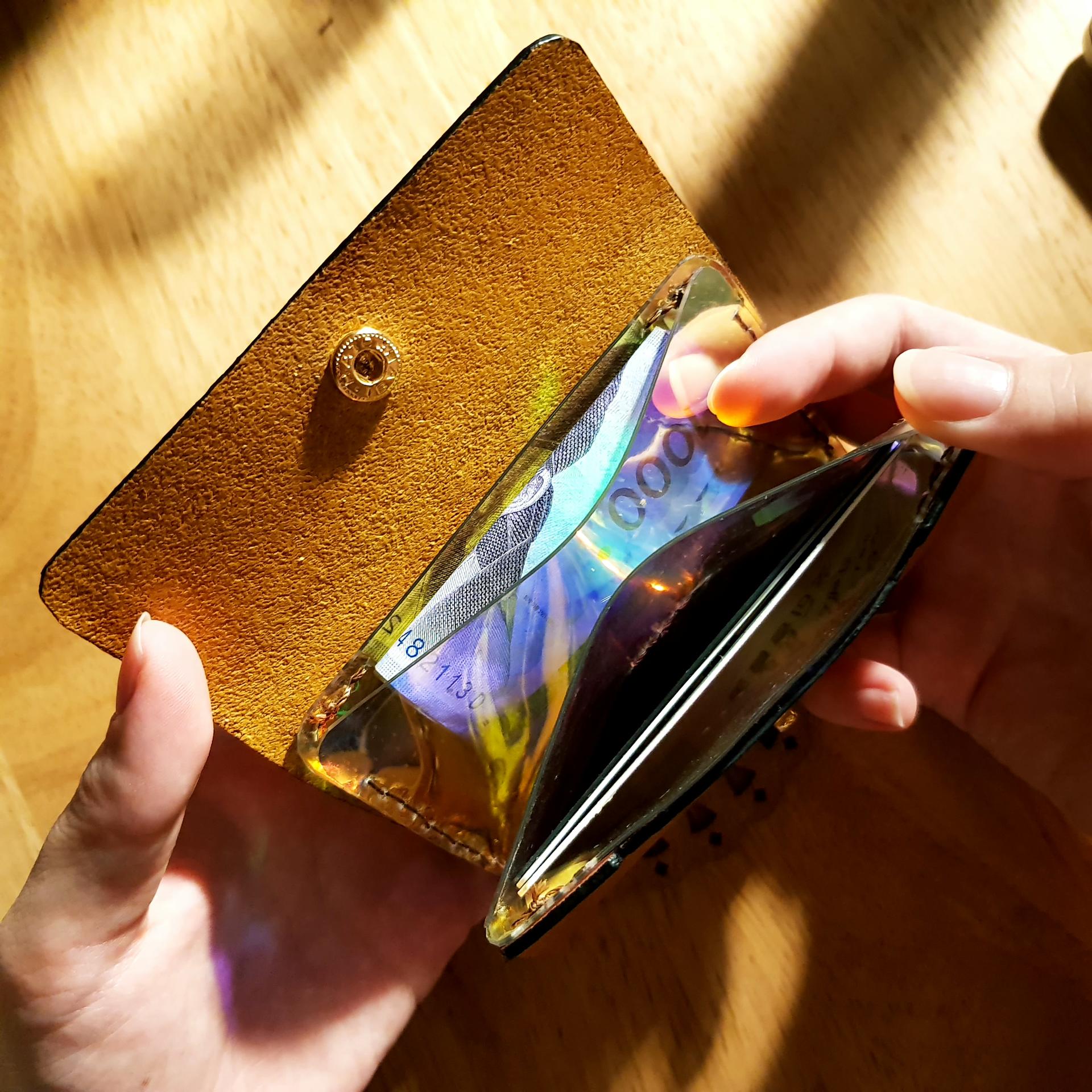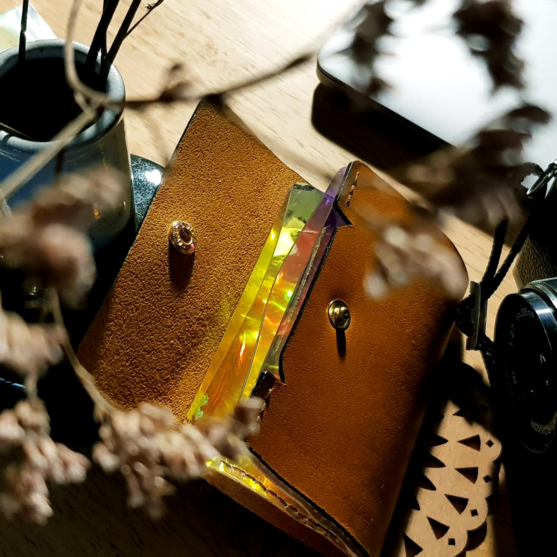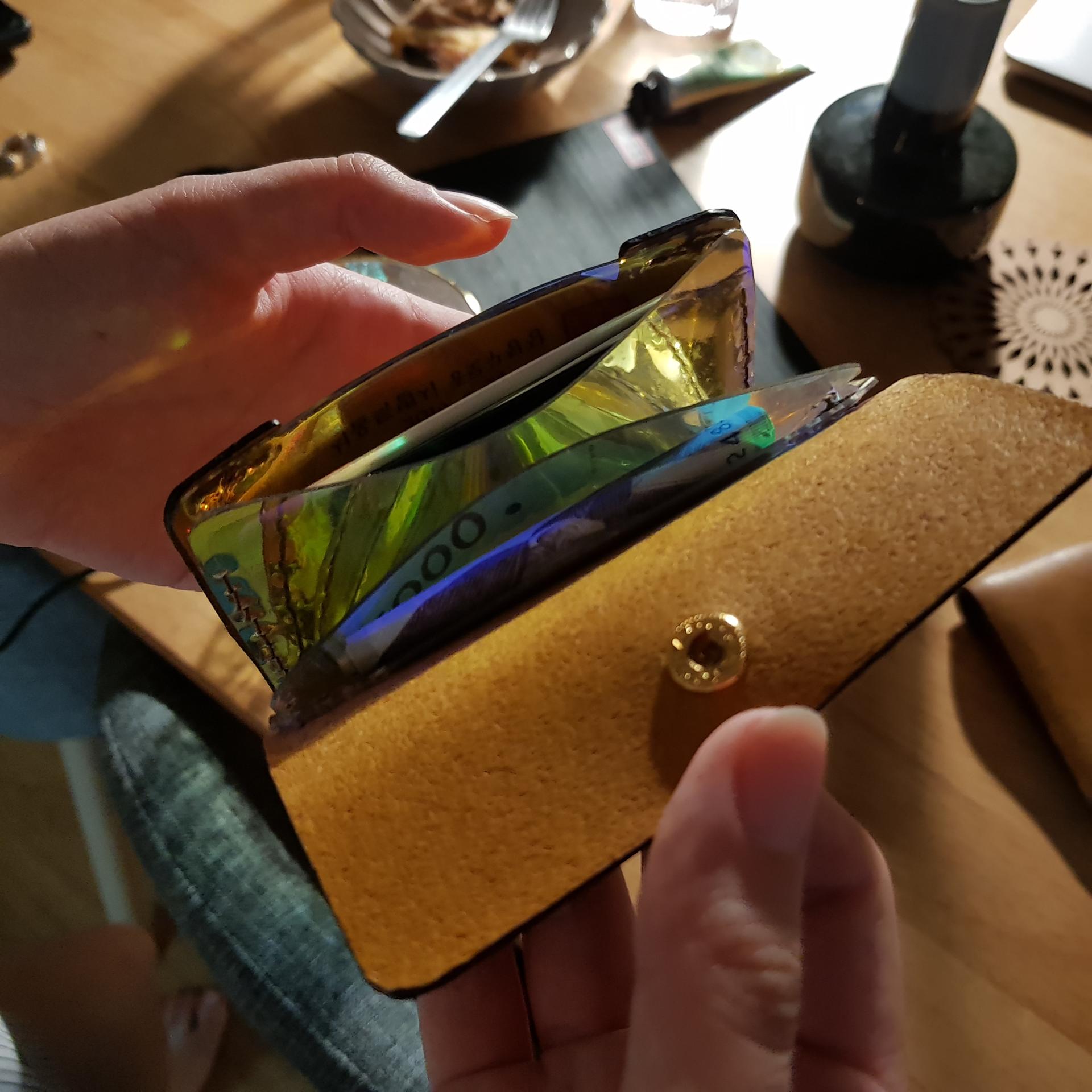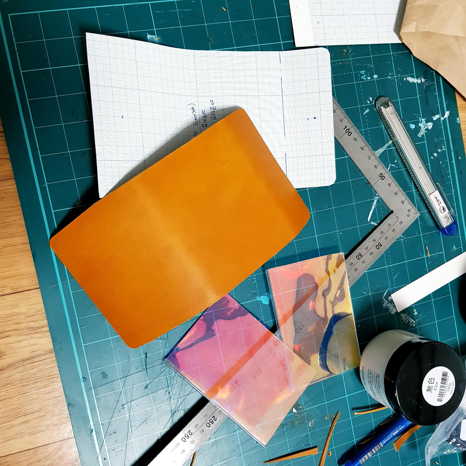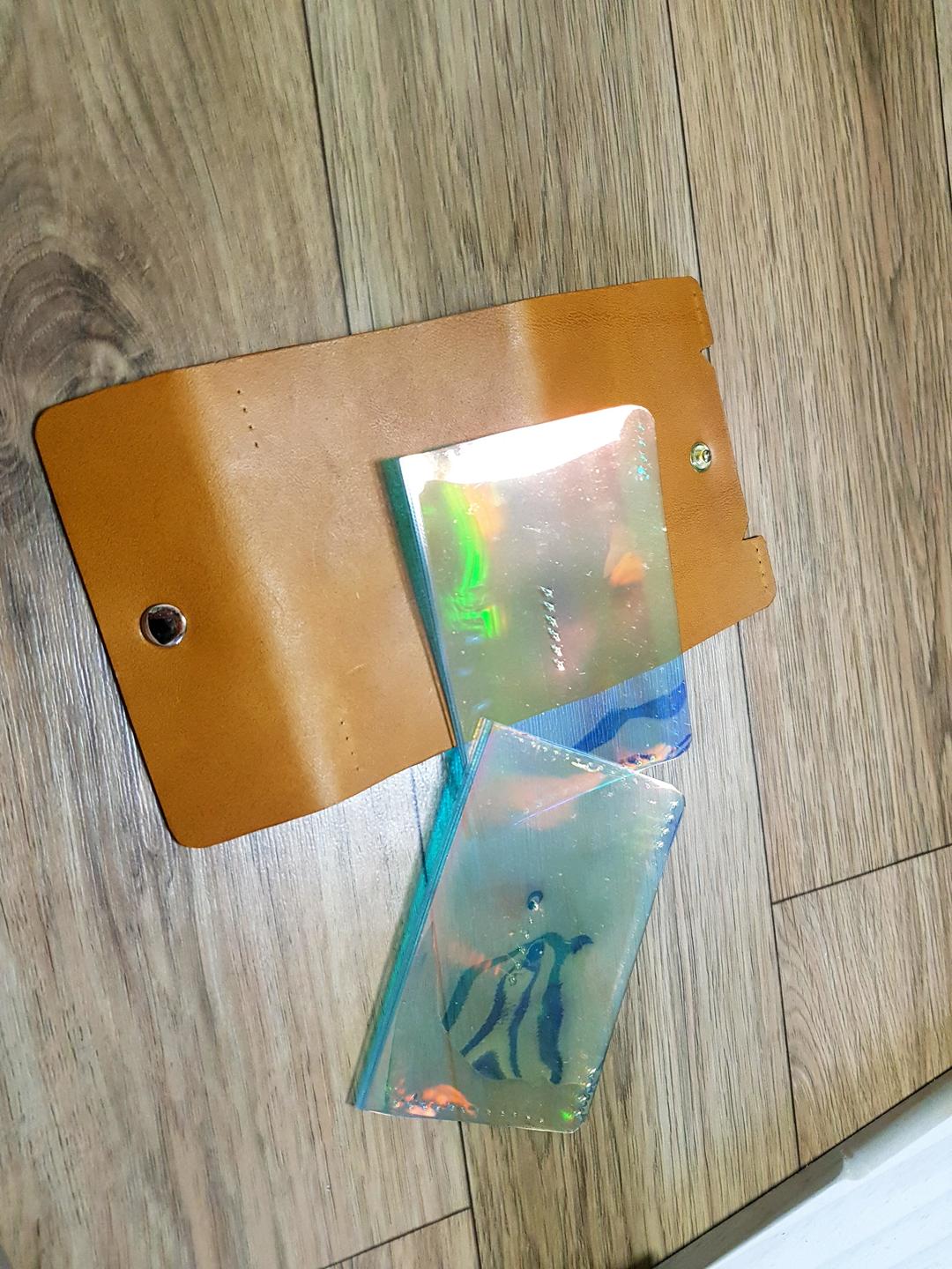먼저 카드 사이즈에 맞춰서 조금 여유를 두어 홀로그램 시트를 2매 자르고, 그 시트에 맞는 사이즈로 가죽을 재단하였습니다.